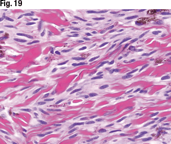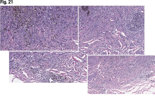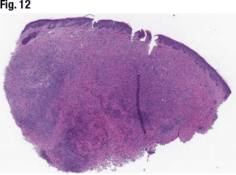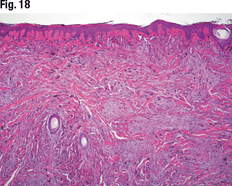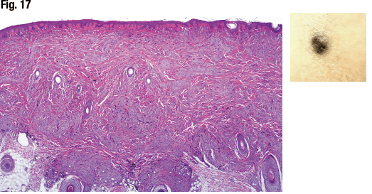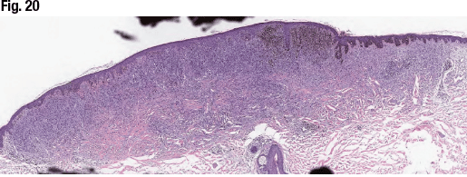 She presented the case of a 19-year-old male with a pigmented nodule on his scalp. Large hypercellular melanocytic proliferation with uniform pigmentation is seen in Fig. 17 and elongation of rete ridges and small junctional component of the melanocytic proliferations in Fig. 18. “We found some of the cells showed very small nucleoli,” Dr. Aung said (Fig. 19). Ki67 staining showed a low to absent proliferative rate. HMB-45 showed diffuse positivity.