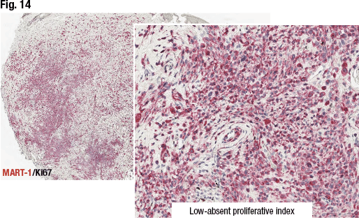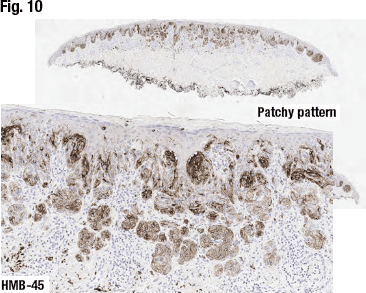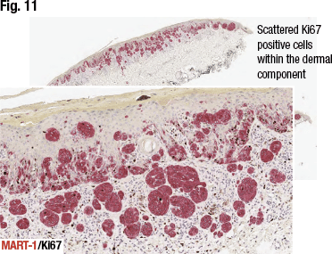 HMB-45 (Fig. 10) showed patchy staining pattern. “Some of it showed strong positivity, and some showed no or low expression. And when we buffered with MART-1/Ki67, it showed some of the dermal melanocytes of the high proliferative rate,” Dr. Aung said (Fig. 11). FISH showed borderline positivity in CDKN2A (p16/CEN9, 25 percent).