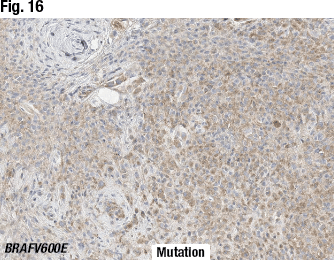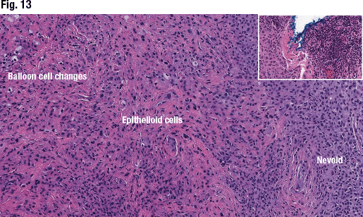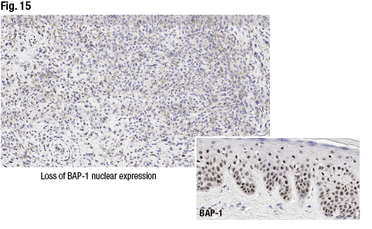 [dropcap]T[/dropcap]he next case is that of a 64-year-old male with a lesion on his right forehead. In Fig. 12 is the diffuse melanocytic lesion with hypo- and hypercellular area. Three cytomorphology features (epithelioid, nevoid, and balloon cells) are seen on high power (Fig. 13). “And the lesions also show associated lymphoid aggregates—one of the features of this type of lesion,” Dr. Aung said. Some of the epithelioid cells show cytologic atypia. “However, buffer MART-1/Ki67 showed low or absent proliferative index,” she said (Fig. 14). The dermal melanocytes showed loss of BAP1 nuclear expression (Fig. 15, compared with positive control showing nuclear BAP1 expression in the keratinocytes within epidermis [inset]). “And BRAF V600E immunohistochemical studies showed positive staining pattern, indicating mutation in these melanocytes” (Fig. 16).