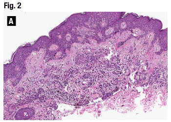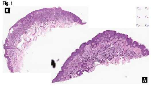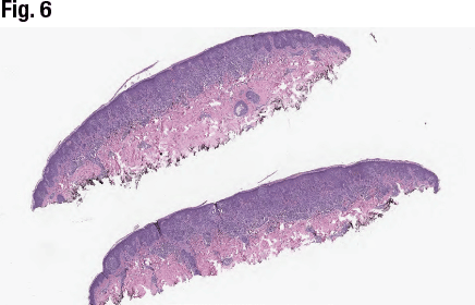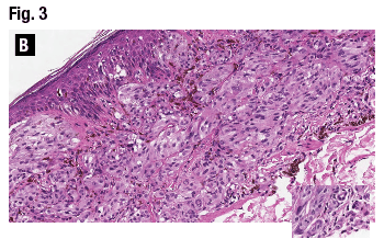 Dr. Aung presented the case of a 21-year-old female with a pigmented lesion on her right inferior lateral back. Seen in Fig. 1 are two fragments of skin with compound melanocytic proliferation. Fragment A (Fig. 2) shows a relatively smaller nest of melanocytes with more nevoid cytomorphology compared with fragment B (Fig. 3), she said, which shows “more atypical epithelioid larger melanocytes with cytologic atypia as well as mitotic activity.”