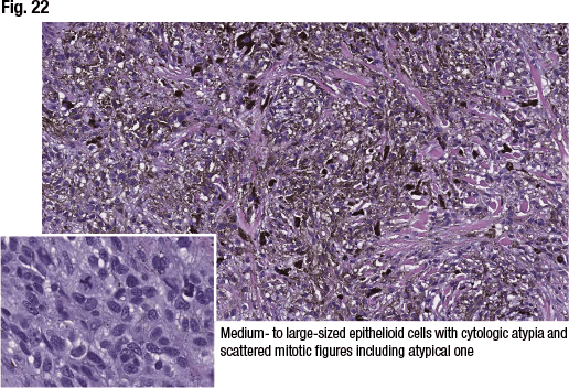 Another case—a 69-year-old with a pigmented lesion on the left scapula—had a diagnosis of blue nevus-like melanoma arising in association with blue nevus (Figs. 20–22). MART-1/Ki67 showed high proliferative rate in large epithelioid melanocytes and low to absent proliferative rate in spindle-shaped melanocytes. HMB-45 showed diffuse expression in epithelioid and spindle cells.