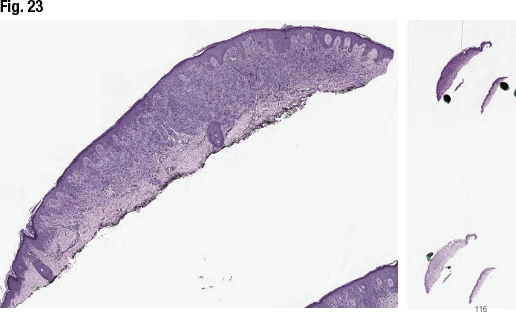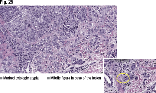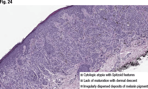 [dropcap]I[/dropcap]n closing, Dr. Aung presented the case of a 20-year-old female with a brown lesion on the thigh that was enlarging and becoming darker. Asymmetrical compound melanocytic proliferation is seen in Fig. 23. In high power the cytologic atypia with Spitzoid features, lack of maturation with dermal descent, and irregularly dispersed deposits of melanin pigment are seen (Fig. 24). In Fig. 25: marked cytologic atypia, showing some of the cells with prominent nucleoli, and mitotic activity at the deeper portion of the lesion. MART-1/Ki67 showed scattered proliferative cells in the dermis and there was patchy expression with HMB-45. “We also performed FISH, which was negative,” she said.