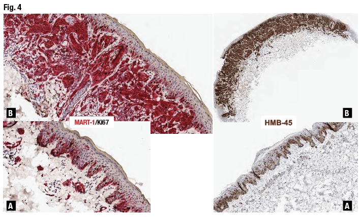 “When we did the HMB-45 stain,” Dr. Aung said (Fig. 4), fragment B showed a diffuse staining of HMB-45, and fragment A showed progressive loss of HMB-45 expression with descent in most of the dermal melanocytes, “highlighting the maturation pattern.”