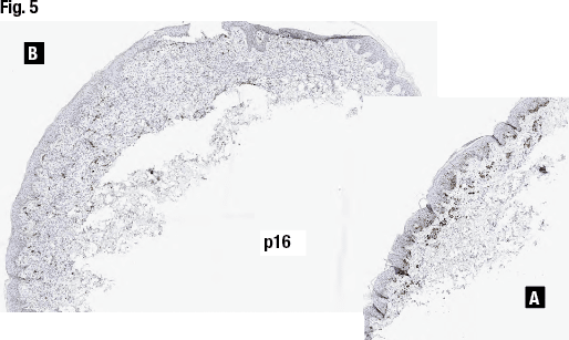 When she and her colleagues looked at the MART-1/Ki67 stain (Fig. 4), the nevoid cells showed no or low proliferative rate, Dr. Aung said, though the epithelioid atypical cell in fragment B showed a relatively high proliferation rate. p16 staining (Fig. 5) showed “complete loss in the atypical cells and the retained nuclear expression pattern in the nevoid cells.”