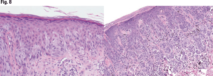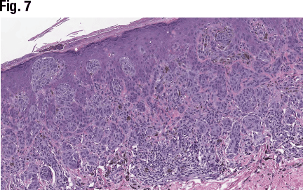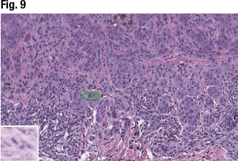 In another case, a 14-year-old female presented with a brown lesion on her right lower abdomen. The asymmetrical but circumscribed proliferation of epithelioid melanocytes is seen in Fig. 6. The cells are arranged with larger nests in the superficial dermis and epidermis (Fig. 7), and Dr. Aung noted the irregularly dispersed pigments and lymphoid aggregates at the base of the lesion. Fig. 8 shows the pagetoid migration of melanocytes at the periphery of the lesion and Kamino bodies, “which are supposed to be seen more frequently in benign [lesions], so this lesion is showing both benign and malignant morphologic features,” she said. In high power (Fig. 9), “this lesion failed to show a maturation pattern.” Some of the lesional cells showed cytologic atypia with pleomorphism, including scattered mitotic figures within the dermis.