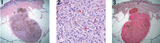 Reliable distinction among SN, AST, and SMM is difficult to make solely on clinical and histopathological grounds because there is significant overlap of features. While several histopathologic criteria have been established in the literature to distinguish SN from AST and SMM,1,2 none have proven to be specific. As such, many borderline or equivocal melanocytic tumors are designated AST or “melanocytic tumor of uncertain malignant potential” (“MELTUMP”), with the notion that long-term followup would retrospectively categorize the lesions as either benign (no recurrence or regional metastasis) or malignant (distant metastasis or death).