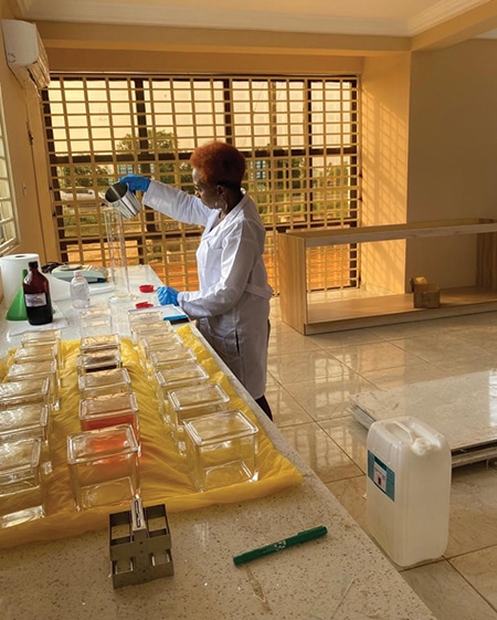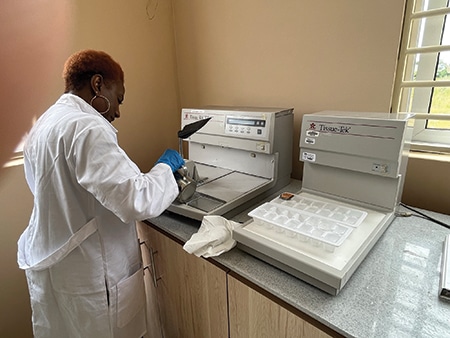 Five years passed, and in 2019 I partnered with Labcorp’s anatomic pathology department at Labcorp’s Center for Esoteric Testing and Atlantic Regional Laboratories in Burlington, NC, to understand what types of equipment were needed to build the laboratory. Over the next year, I worked with Labcorp’s sourcing and procurement department to locate used equipment the company could donate. It was shipped to the Midwest mission distribution center, Pawnee, Ill., pending evaluation by an IHDN member. By late winter 2022, IHDN had recruited Muriel Washington, pathology manager and histotechnologist at Springfield (Ill.) Memorial Hospital, who evaluated the equipment and found the tissue processor and embedding center to be irreparable.