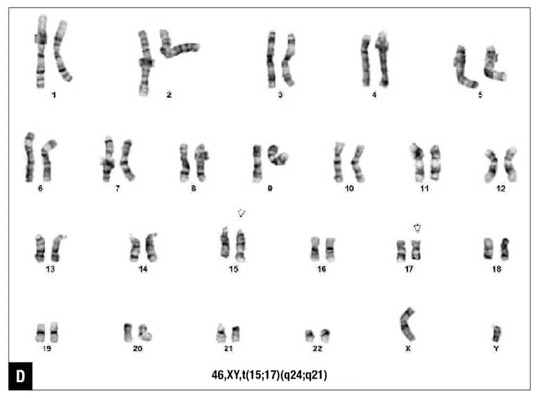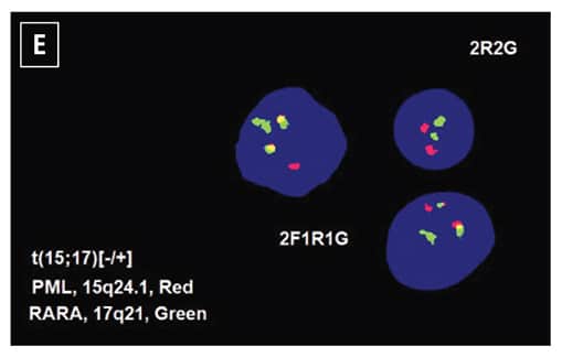 The patient was diagnosed with acute myeloid leukemia, and 7+3 chemotherapy regimen (cytarabine and daunorubicin) was initiated. Five days after the initiation of chemotherapy, routine chromosome analysis demonstrated an abnormal male karyotype with translocation between the long arms of chromosomes 15 and 17, t(15;17)(q24;q21), in 18 of 21 metaphases examined (Fig. 1D). Also, FISH confirmed the presence of t(15;17)(PML::RARA) in 82 percent of the interphase nuclei (Fig. 1E). Taken together with the morphologic and flow cytometry findings, the diagnosis was revised to APL following the results of ancillary studies,5 and ATRA therapy was initiated.