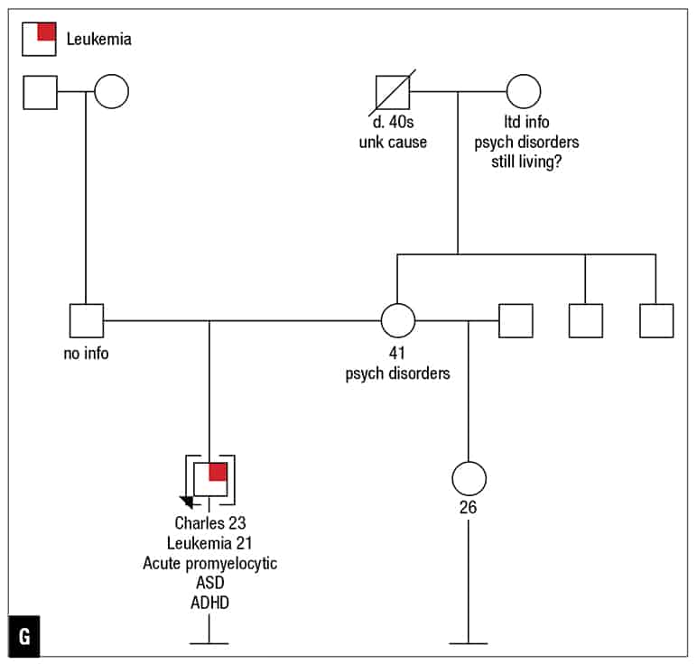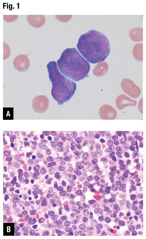 Case. A 21-year-old adopted male patient with a past medical history of autism spectrum disorder and obsessive-compulsive disorder presented to an urgent care center with nausea, vomiting, congestion, mild cough, and abdominal pain in August 2021. A complete blood count demonstrated hemoglobin of 11.7 g/dL (11.4–17.1 g/dL), white blood cell count of 12.4 × 103/µL (3.1–10 × 103/µL), and platelet count of 41.0 × 103/µL (126–362 × 103/µL). In addition, the WBC differential count revealed increased blasts (29 percent). Blood coagulation tests were significant for prothrombin time of 19.1 seconds (11.9–14.1 seconds) and INR of 1.66 (0.9–1.1). Repeat blood cultures demonstrated no growth, and testing for COVID-19, HIV, and hepatitis C viruses was negative. CT imaging of abdomen/pelvis revealed splenomegaly with findings suggestive of splenic infarct with consideration for lymphoma or other lymphoproliferative process. He was subsequently transferred to Emory University Hospital for further evaluation of suspected acute leukemia.