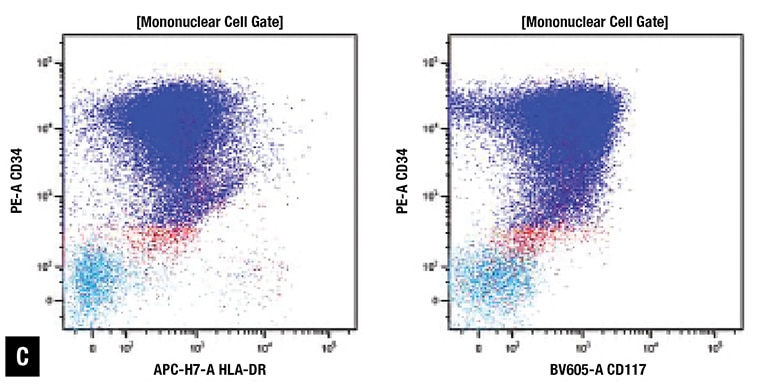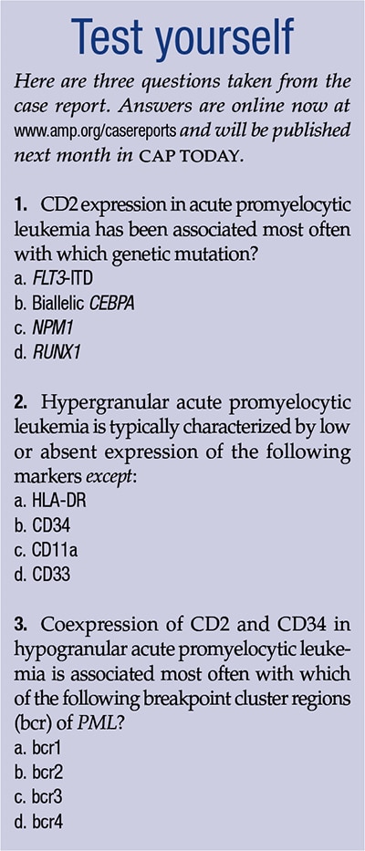 Discussion. While this patient’s clinical presentation (leukocytosis and DIC) may appear more consistent with hypogranular APL, these manifestations may also be seen in other AMLs. In addition, the morphology and immunophenotypic profile of the leukemic blasts are not typical of hypogranular APL. Specifically, the leukemic blasts do not display the characteristic bilobed or butterfly-shaped nuclei morphologically. In addition, Auer rods were not identified. Immunophenotypically, the leukemic blasts exhibited low side scatter with expression of many myeloid lineage markers and coexpression of CD34, CD117, and HLA-DR, which is unusual for APL. Although aberrant CD2 expression has been associated with FLT3-ITD in APL,2 it is not specific and is frequently seen in other AMLs.