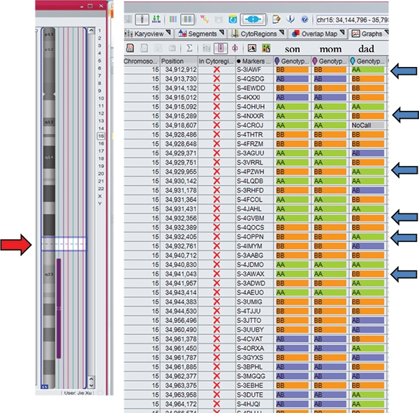Case studies. Case 1: A two-week-old male born to a 44-year-old woman presented with hypotonia, cryptorchidism, poor feeding, and dysmorphic features, and was small for gestational age. MSPCR amplified only a 174-bp fragment from the maternal methylated SNRPN gene, consistent with PWS (Fig. 1). SNP chromosomal microarray analysis was performed using the CytoScan Dx assay and did not show deletion of 15q11.2q13 or any clinically relevant copy number changes. However, an approximately 28-Mb region of homozygosity was seen in interstitial 15q: 15q22.31q26.1. Trio MIE analysis showed chromosome 15 MIEs were high for the trio (7.45 percent) and father (7.28 percent) and low for the mother (0.01 percent), indicative of mUPD 15.4 A graphical representation of genotypes for the trio is displayed in Fig. 2 (as a visual confirmation of the MIE value). The proband and mother shared identical genotype calls for proximal 15q: 15q11.2q22.31 and distal 15q: 15q26.1q26.3, consistent with maternal heterodisomy (Fig. 2a). The proband had homozygous genotype calls for interstitial 15q: 15q22.31q26.1, consistent with maternal segmental isodisomy (Fig. 2b).
