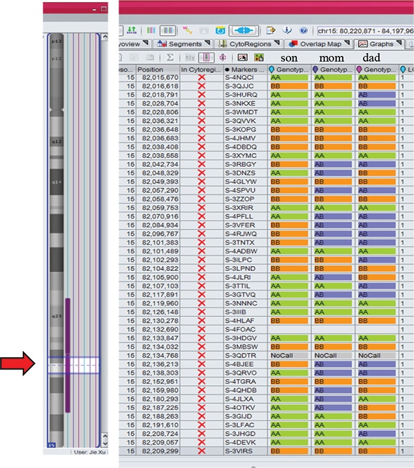 Case 2: A three-week-old male born to a 39-year-old woman presented with hypotonia, feeding difficulties, and undescended testes. MSPCR was consistent with PWS. FISH was negative for deletion of SNRPN at 15q11.2q13. The CytoScan Dx assay did not show deletion of 15q11.2q13 but did show an approximately 11.8-Mb region of homozygosity in distal 15q: 15q26.1q26.3. Additionally, an approximately 136-kb duplication of 2q24.2 involving three OMIM genes (CD302, MARCH7, and LY75) was seen. Trio SNP chromosomal microarray studies showed the duplication was maternally inherited and of uncertain significance. Trio MIE analysis showed chromosome 15 MIEs were high for the trio (6.26 percent) and father (5.94 percent) and low for the mother (0.01 percent), indicating mUPD 15. The proband and mother shared identical genotype calls for proximal 15q: 15q11.2q26.1, confirming maternal heterodisomy. The proband had homozygous genotype calls for distal 15q: 15q26.1q26.3, consistent with maternal segmental isodisomy.