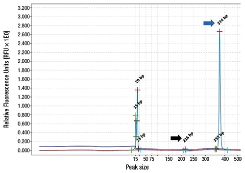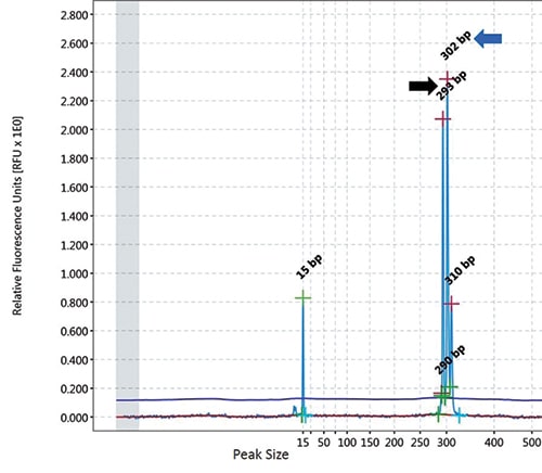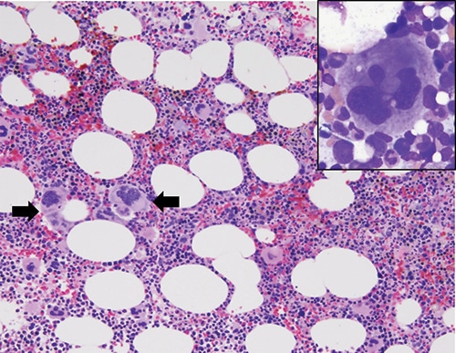 Case. A 67-year-old female presented with a nine-year history of persistent thrombocytosis (platelet counts ranged from 450,000 to 500,000 per microliter) without evidence of thrombosis or bleeding. JAK2 V617F, JAK2 exon 12, and CALR variant analyses were performed on peripheral blood. JAK2 exon 12 variant analysis was negative. A low-allele fraction (approximately one percent) pathogenic variant involving JAK2 V617F was detected (Fig. 1). CALR exon 9 variant analysis was positive for a 9-basepair deletion (47 percent allele fraction, likely germline heterozygous) (Fig. 2). Repeat testing by a national reference laboratory using polymerase chain reaction and fragment analysis confirmed the 9-bp deletion and noted the finding to likely represent a previously described in-frame germline polymorphism of no known clinical significance. Bidirectional Sanger sequencing using an ABI 310 genetic analyzer disclosed a novel 9-bp deletion (CALR: c.1280_1288del) predicted to be of no clinical significance due to preservation of the C-terminal KDEL (endoplasmic reticulum retention sequence) signal sequence. A bone marrow biopsy revealed a mildly hypercellular marrow (about 50 percent cellularity) with megakaryocytic hyperplasia. Occasional megakaryocyte clusters and frequent large, atypical forms with abundant mature cytoplasm and hypersegmented nuclei were identified (Fig. 3, page 28). The granulocytic and erythroid lineages showed no morphologic abnormalities. Cytogenetic studies demonstrated a normal female karyotype. The bone marrow findings in conjunction with a known JAK2 V617F pathogenic variant are diagnostic of a myeloproliferative neoplasm, most consistent with essential thrombocythemia.