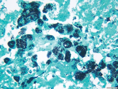 Grocott’s methenamine silver stain (GMS) demonstrated thin bacilli within macrophages in areas of acute inflammation and necrotic debris (Fig. 4). Periodic acid-Schiff stain (PAS) revealed macrophages with abundant PAS-positive inclusions (Fig. 5). Both Gram and acid-fast stains (Ziehl-Neelsen stain) were negative. All cultures were also negative. These findings favored Tropheryma whipplei infection. Since PAS and GMS are nonspecific, molecular analysis was sought to prove this diagnosis.