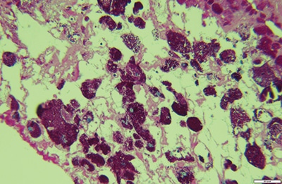 Details of the pathology. Grossly, aortic valve leaflets were fragmented with a fibrotic thickened surface covered by vegetations and calcifications (Fig. 1). Microscopic examination demonstrated multiple foci of acute and chronic inflammation of valve leaflets, with cusp destruction and marked infiltration by basophilic foamy macrophages and multinucleated giant cells, admixed with acute inflammation in necrotic debris (Figs. 2 and 3). Myxoid degenerative changes with dystrophic calcifications and hemosiderin-laden macrophages were also present.