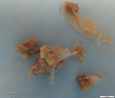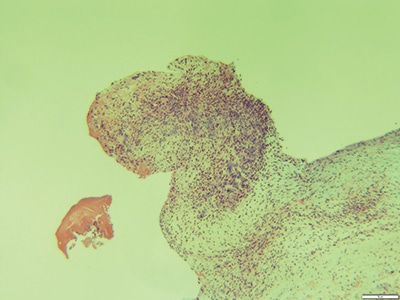The patient was started on a proton pump inhibitor, amoxicillin, and clarithromycin. Transthoracic echocardiogram noted a 7.6-mm lesion on the aortic valve. Transesophageal echocardiogram demonstrated aortic valve leaflets to be severely thickened with reduced systolic excursion and oscillating vegetations on two cusps suggestive of endocarditis. Patient denied history of worsening arthralgias, nausea, vomiting, weight loss, swimming, travel, hunting, dental procedures, sick contacts, or animal contacts. He did admit to a two- to three-month history of night sweats. Multiple blood cultures were negative. Patient was taken to surgery to replace the aortic valve; vegetations were present on all three aortic valve leaflets, with destruction of the right coronary and noncoronary cusps. The excised aortic valve was submitted for culture, histology, and molecular analysis.