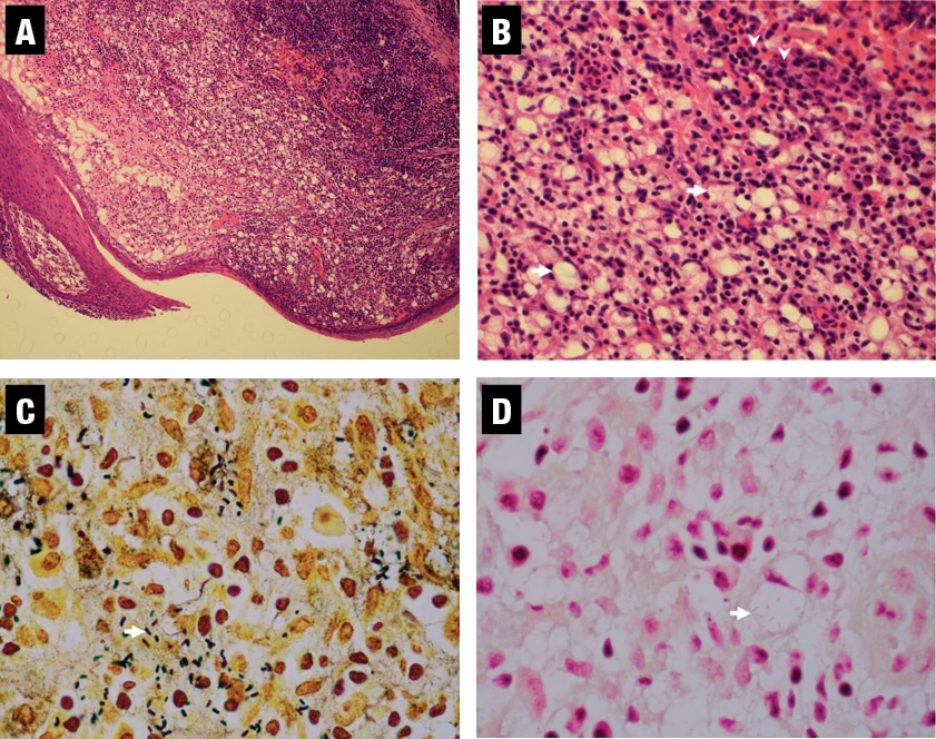 Clinically, rhinoscleroma generally has three disease stages, including a relatively short (weeks to months) catarrhal-atrophic stage in which patients typically present with rhinorrhea and recurrent sinusitis, a prolonged (months to years) granulomatous stage characterized by mass formation with tissue destruction, and a chronic sclerotic/fibrotic stage with extensive tissue scarring and fibrosis.2 In this case, our patient’s presentation was most consistent with the granulomatous stage, which can present with symptoms such as nosebleeds, nasal and/or respiratory tract obstruction, loss of sense of smell, a hoarse voice, and thickening or numbing of the soft palate.2,3 The diagnosis requires clinical correlation and is made by histological examination and confirmed by cultures. The differential diagnosis includes granulomatous bacterial, fungal, or protozoan infections present in endemic areas; vasculitis; and neoplastic processes affecting the nose and upper airways, including the lips and soft palate.2,3