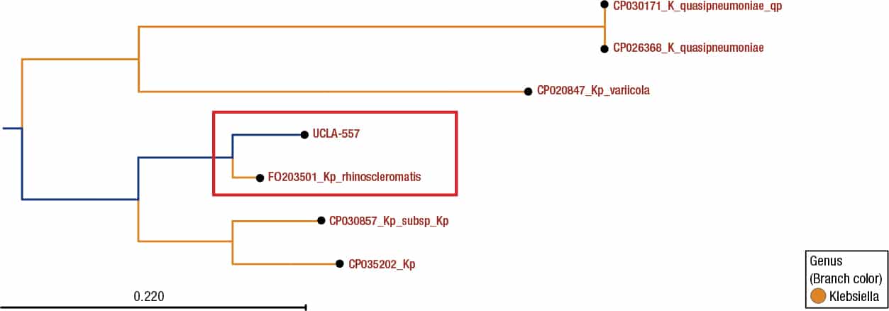 Molecular analysis. To confirm our preliminary diagnosis, we performed whole genome sequencing (WGS) analysis of the isolate (UCLA557) on MiSeq (Illumina), using 2 × 250 bp protocol and analyzed using CLC Genomics Workbench (Qiagen), following a recently validated workflow.1 Briefly, raw sequences were trimmed and paired by the CLC Genomics Workbench where de novo sequence assembly was performed. Several contigs with a size range of 2,000–10,000 bp were extracted and analyzed using the Basic Local Alignment Search Tool (BLAST) nr/nt database (https://blast.ncbi.nlm.nih.gov/Blast.cgi) to obtain an appropriate reference genome for mapping. The reference genome was downloaded to CLC Genomics Workbench where three target genes (i.e. 16S rRNA, rpoB, and groEL [hsp65]) were identified, extracted, and concatenated. The sequence reads were then mapped to the concatenated reference sequence. The consensus sequence of each target gene was then queried using the BLAST nr/nt database. The isolate was identified as K. pneumoniae subsp. rhinoscleromatis with 100 percent query coverage and 100 percent identity for all three target genes. Phylogenetic analysis of the WGS using k-mer tree clustering further confirmed UCLA557 to be K. pneumoniae subsp. rhinoscleromatis (Fig. 3). Notably, we found that the 16S rRNA gene sequence alone is insufficient to identify any subspecies of K. pneumoniae, as the BLAST results showed the exact same scores (100 percent coverage, 100 percent identity) for both K. pneumoniae and K. quasipneumoniae, two closely related species.