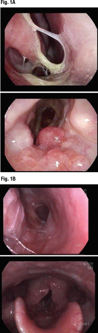 At the initial consultation with our service, laryngostroboscopy revealed unrestricted vocal cord movement but demonstrated approximately 75 percent subglottic stenosis that had highly irregular mucosa with thickened mucus throughout the upper airway, and multiple dimpled points of hypertrophic mucosa (Fig. 1A). The initial differential diagnosis included connective tissue disorders, infectious processes, or neoplasms. Surgery was urgently recommended to treat the narrowed airway and obtain biopsy tissue for diagnosis.