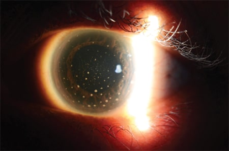 Slit-lamp examination of the eye revealed the presence of keratic precipitates on the corneal endothelium (Fig. 1), active anterior chamber activity, and dense vitritis consistent with panuveitis. Paracentesis of the anterior chamber was performed and the aqueous fluid sent for infective screening. This included pathogen-directed polymerase chain reaction analysis for tuberculosis mycobacterium, cytomegalovirus, herpes simplex virus, varicella-zoster virus, and Toxoplasma gondii, all of which were negative. A full blood count did not show any leukocytosis, C-reactive protein was low (1.5 mg/L), and erythrocyte sedimentation rate was only slightly raised for her age (34 mm/hr). Screening from serum for syphilis and TB were also negative.