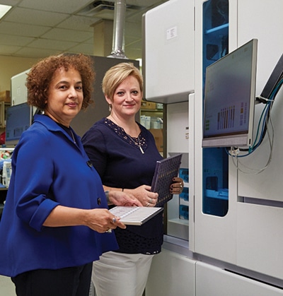The automation process started about 10 years ago with two automated stainers for H&Es, three automated stainers for special stains, and 2D barcoding. Today, “barcoding is in place in the gross lab, in histology, and IHC, and extends into molecular. While it cannot be used on the Agilent instruments, it is in use on all the lab’s Roche Ventana instruments.” That not only sharpens patient identification but also helps trace the source of adverse events more efficiently. “We look at a number of recuts and are able to identify which tech cut them so we can do retraining where necessary or maybe have a staff member realize they need to slow down,” Franklin says. Turnaround time has decreased to 1.5 days or less on the smaller cases—a sharp drop from a nearly 2.5-day TAT before—and there is a TAT of four days on complex cases.