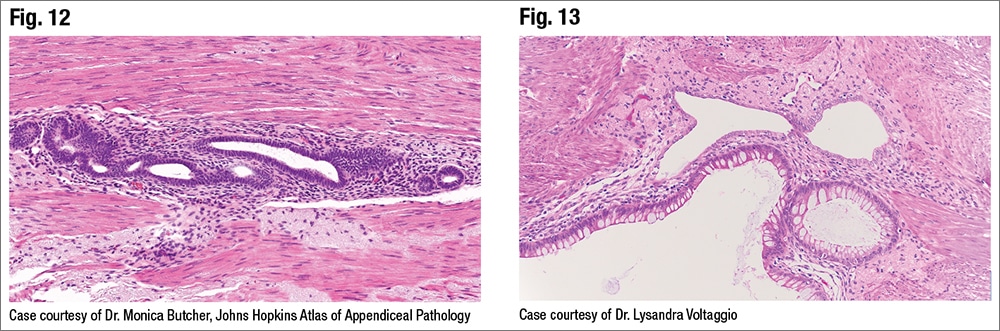 Endometriosis with intestinal metaplasia is one pitfall, Dr. Birkness-Gartman said. “It can potentially mimic a low-grade appendiceal mucinous neoplasm or LAMN.” Associated endometrial-type stroma is a clue, she said. Endometrial-type glands with intestinal metaplasia will label for the intestinal marker. “Luckily, the endometrial stroma retains the expected labeling pattern and is positive for ER and CD10,” she said. In a high-magnification image of endometriosis with intestinal metaplasia (Fig. 13), the endometrial-type stroma surrounding the glands has a spindled appearance and “is a clue to the correct diagnosis in this case” (Vyas M, et al. Pathol Res Pract. 2017;213[1]:39–44).