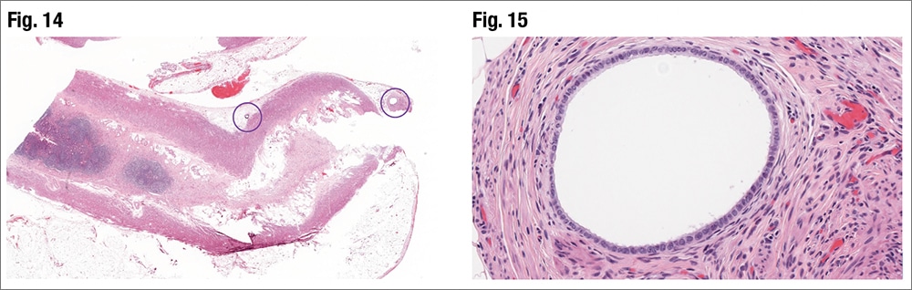Dr. Birkness-Gartman presented the case of a 40-year-old woman with a history of ampullary adenocarcinoma who underwent a Whipple procedure with en bloc ileocecectomy. Incidental glandular-type structures are seen in Fig. 14 in the periappendiceal adipose tissue and at higher magnification there is no associated endometrial-type stroma (Fig. 15). It is lined by cuboidal epithelial cells that have cilia on the luminal surface. Appendiceal endosalpingiosis is an incidental finding in this case, she said.