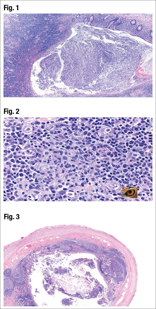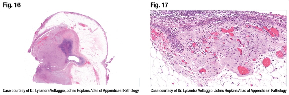 In this case, there is a traditional serrated adenoma and, secondly, an inverted appendix, Dr. Birkness-Gartman said. “We had a neoplasm that arose in the appendix and it essentially served as a lead point, and the appendix turned inside out. It became inverted.” Appendiceal inversion has been associated with various neoplasms and with endometriosis—“basically anything that can serve as a lead point for intussusception,” she said (Birkness J, et al. Histopathology. 2019;74[6]:853–860).