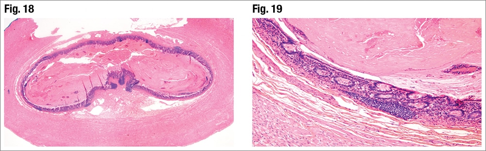 [dropcap]I[/dropcap]n Dr. Pezhouh’s discussion of structural abnormalities of the appendix, she presented the case of a 50-year-old male with appendiceal irregularity, a mass lesion on imaging, and a medical history of diabetes and cystic fibrosis. He underwent an appendectomy. In Fig. 18 the lumen is dilated and “filled with pink eosinophilic mucus,” she said. In Fig. 19 some of the crypts are enlarged and have inflammatory cells in them mixed with eosinophilic secretions.