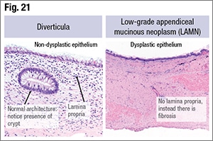 Complicated diverticulosis, when it’s associated with mucus cysts and enlargement of the appendix, can resemble LAMN, Dr. Pezhouh said. Retention of the normal mucosal architecture with lamina propria is one indication of diverticular disease, she said. Other clues in favor of diverticulosis: crypt architecture is maintained, crypts are arranged in a regular array, and there is a lack of nuclear abnormalities. (See Fig. 21.)