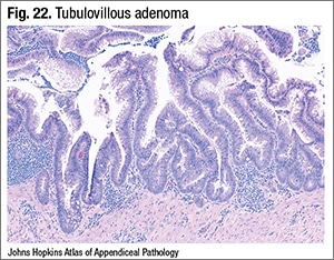 In distinguishing appendiceal polyps from LAMN, she said, “you should see [in appendiceal polyps] preserved lamina propria and muscularis mucosae, and this should not show pushing invasion where you lose those structures and get underlying fibrosis.” The cytologic features of a tubulovillous adenoma involving the appendix are seen in Fig. 22—“typical conventional low-grade dysplasia with elongation, crowding, and hyperchromasia of the nuclei,” Dr. Birkness-Gartman noted, as well as “retained architecture of the lamina propria and muscularis mucosae, which is why I would not diagnose this as a LAMN.”