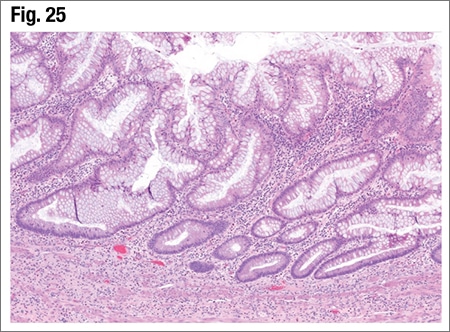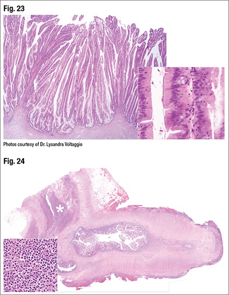 She presented the case of a 45-year-old woman with an elongated, polypoid mass at the appendiceal orifice who was treated with an ileocecectomy. The bisected lesion revealed a core of adipose tissue, and in Fig. 23 the villiform structure and pink epithelium is seen. On the right in Fig. 23 “we see the diagnostic feature, which is ectopic crypt foci with little crypts sort of budding off of the villi, and they’re not oriented with their bases toward the muscularis mucosae.”