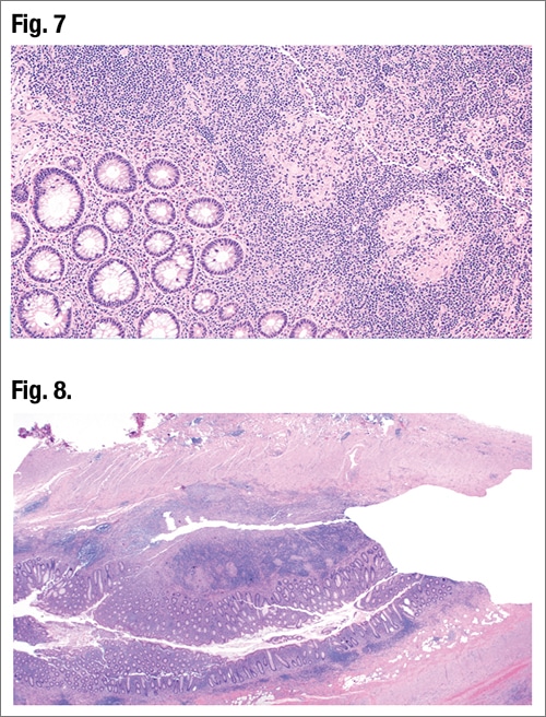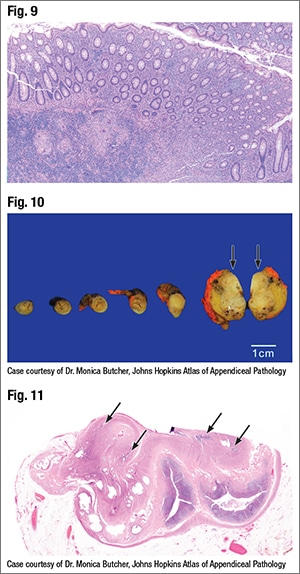 In Fig. 8 is an example of Crohn’s disease as seen in a longitudinal section of the appendix. It was the case of a 36-year-old female with a past medical history of Crohn’s disease and refractory treatment who presented for ileocolonic resection, Dr. Pezhouh said. The inflammation is transmural. In Fig. 9 granulomas are visible with focal areas of mild acute inflammation.