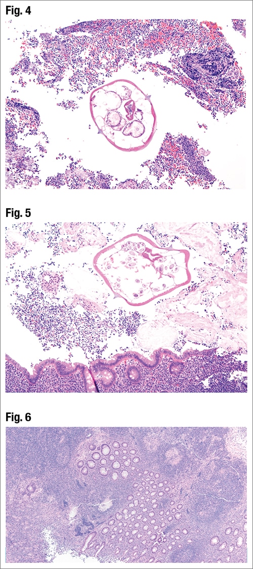 In the case of an eight-year-old boy who presented with abdominal pain and signs of acute appendicitis and who underwent an appendectomy, Dr. Pezhouh said inflammatory cells were seen in the lumen of the appendix and, on higher power, something else could also be seen in the lumen (Fig. 3). In Fig. 4 is a cross-section of a worm in the lumen, and in Fig. 5 is another worm or another section of the same worm, and eggs can be seen. It is Enterobius vermicularis, or pinworm, for which lateral alaes are characteristic. Furthermore, typically Enterobius vermicularis eggs are plano-convex with one flattened side and one convex side. Enterobius vermicularis usually affects children ages seven to 11 and is an incidental finding, she said. Sometimes a mass of worms can cause obstruction in the GI tract or appendix, and occasionally pinworm can be associated with acute appendicitis. “Adult worms can also migrate to the lower genital tract and cause a granulomatous reaction, and the same goes for the appendix,” Dr. Pezhouh said, though there were no granulomas in the case she reported.