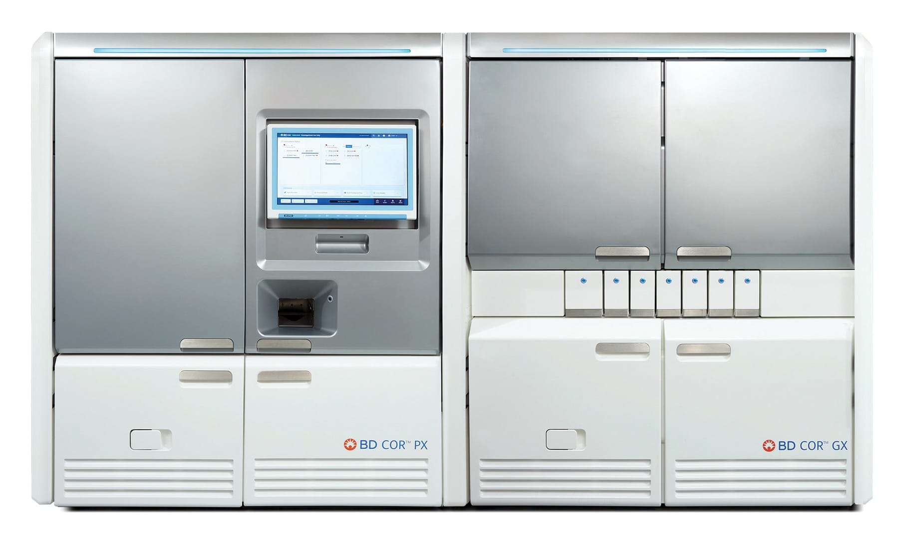 The BD COR system offers two instruments: the BD COR PX integrates and automates the sample workflow for diagnostic specimens and assays, and the BD COR GX automates specifically the BD Onclarity HPV assay with extended genotyping. The PX instrument will prepare samples by performing preanalytical processing steps and automatically deliver the samples to the GX instrument for analysis. The GX instrument will perform the analytical steps of the BD Onclarity HPV assay, including extraction, amplification, and detection.