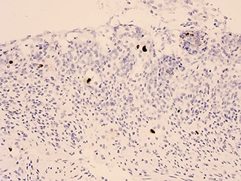 - Report whether the viral inclusions are visible on the H&E or only on the IHC. “Even if the IHC is positive, I’ll go back to the H&E and report if I can see them on the H&E because that may indicate more severe disease,” he said. “And I will report the number of IHC-positive cells in the single most involved tissue fragment, knowing that a threshold for high-grade disease is not established. I’ll at least give a number or say whether they’re numerous or it’s a single inclusion.”