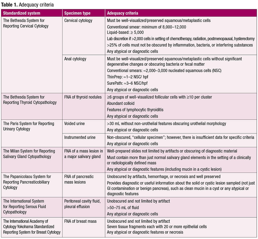 Table 1 summarizes some of the published criteria for defining specimens as adequate. The common theme in each system is quantitative (number of cells) and qualitative (distinct and clear visualization of cells); acellular/sparsely cellular or degenerated samples are typically interpreted as non-diagnostic/inadequate for evaluation. There are, however, some specimen types/sites, such as bronchial brushing, bronchoalveolar lavage, cerebrospinal fluid, lymph nodes, bone lesions, and synovial fluids, for which the adequacy criterion is not clearly defined and others (i.e. serous effusions, salivary gland, and voided urine) for which the adequacy criterion is not fully accepted.