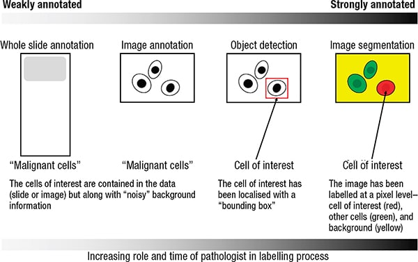 Figure 3 Levels of dataset annotation (from weakly annotated to strongly annotated). Increased levels of annotation require greater pathologist input and time. McAlpine ED, Michelow P. The cytopathologist’s role in developing and evaluating artificial intelligence in cytopathology practice. Cytopathology. 2020;31(5):385–392. Reprinted with permission.