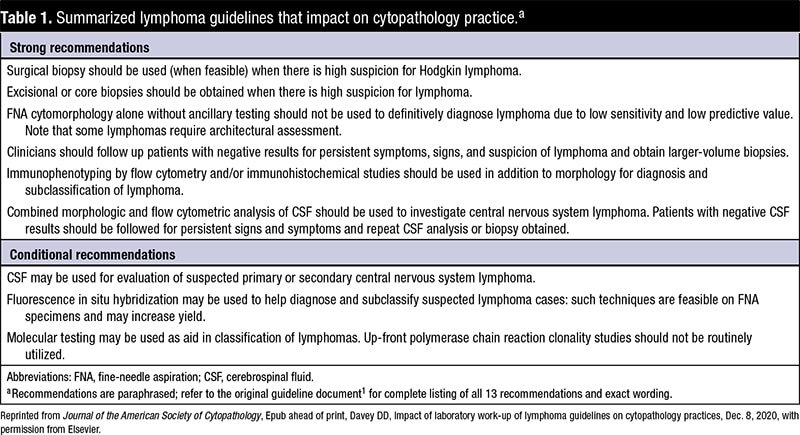 One of the guidelines addressed the use of fine-needle aspiration specimens for lymphoma diagnosis, with the panel recommending against the use of cytomorphology alone in these specimens, without the use of ancillary studies, to diagnose lymphoma. Despite its negative verbiage, the guideline does not discourage the use of FNA in triaging lymph node specimens. Diane D. Davey, MD, a pathologist board certified in cytopathology and hematopathology, served on the advisory panel and wrote a commentary on the impact of the guidelines on cytopathology practice, which is the second recommended reading article.2