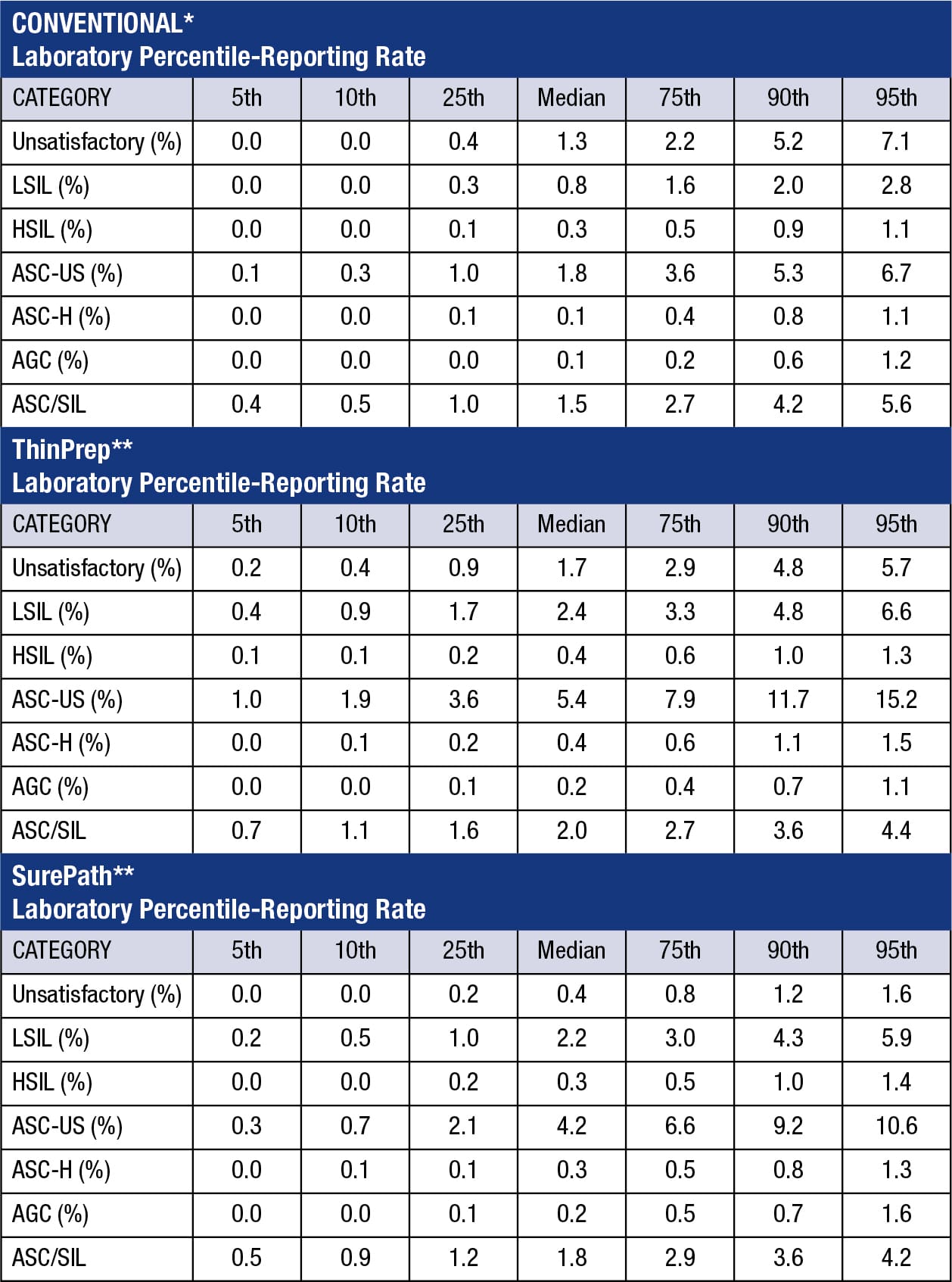 The benchmarking data listed in the table are based on 2021 case volumes. These benchmarking data may not be applicable for laboratories that utilize primary HPV screening for a significant portion of cervical cancer screening. Results were excluded for laboratories that included primary HPV screening results in the interpretive totals when more than 25% of their cervical/gynecologic cytology slides were from positive primary HPV screening. In evaluating its statistics, the laboratory’s patient population should be taken into consideration. Percentile-reporting rates refer to the distribution of individual laboratory responses from reporting rates in various categories. Responses are ranked from lowest to highest, and the 50th percentile-reporting rate refers to the median response. A 25th percentile-reporting rate (which corresponds to 1.7% in the table) for the ThinPrep LSIL category means that a quarter of laboratories have LSIL rates of 1.7% or less. A 90th percentile-reporting rate (which corresponds to 11.7% in the table) for ASC-US in ThinPrep preparations means that 9 of 10 laboratories have an ASC-US rate of 11.7% or less.