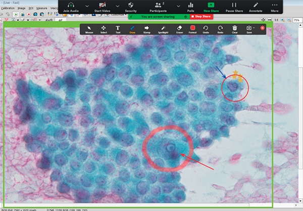 A variety of annotation tools are available on the Zoom platform (support.zoom.us/hc/en-us/articles/115005706806-Using-annotation-tools-on-a-shared-screen-or-whiteboard, accessed 12/05/2020). It is a good tool to engage the learners; questions can be asked that require annotating on the presenter’s screen (Fig. 1). Learners in cytopathology like the annotation resource because it allows for the teacher to point out morphological details precisely, better than using a pointer in a multiheaded microscope.