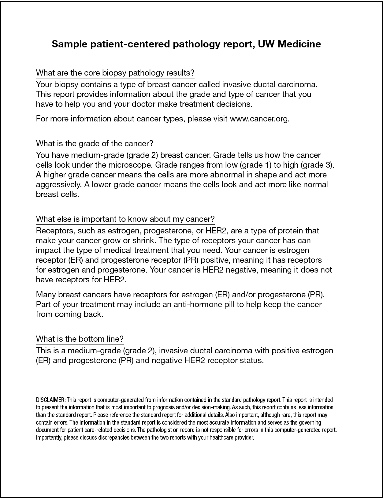 The patient-centered reports are generated from the information in the standard pathology report, but they’re brief—a breast core needle biopsy report, for example, is only a half-page long—and they include only the elements most relevant to the patient, such as diagnosis, grade, and hormone receptor status (sample PCPR, below). The reports are written at the sixth-grade reading level and follow a question-and-answer format. Grade, for example, is described as “how the cancer cells look under the microscope.”