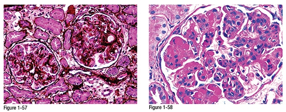 Light microscopy: The glomeruli show mesangial hypercellularity, infiltration of the capillary lumina by inflammatory cells (endocapillary hypercellularity), and rare intraluminal, glassy appearing deposits (pseudo thrombi) obliterating the capillary lumina (Jones silver Figure 1-57). The intraluminal homogeneous, glassy appearing deposits are strongly PASH positive (PASH Figure 1-58).