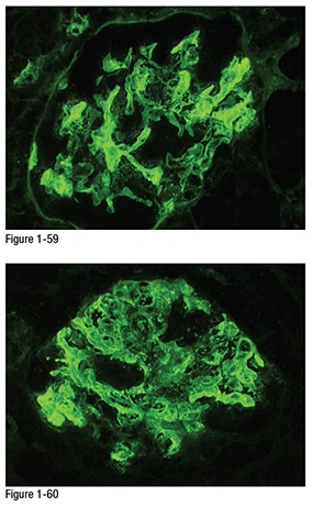 Immunofluorescence: There is strong granular and chunky peripheral capillary loop and intraluminal staining for IgG (Figure 1-59), IgM (Figure 1-60), and kappa (Figure 1-61), as well as weak staining for lambda (Figure 1-62). The large immune complex deposits along the capillary loops appear sausage shaped with smooth outer contours indicative of the subendothelial location of these deposits.