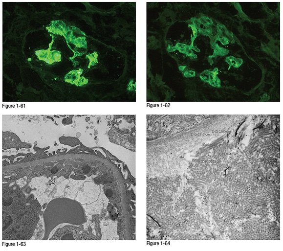 Electron microscopy: There are frequent subendothelial immune complex deposits (Figure 1-63), which on high power show short curvilinear microtubular substructure with hollow centers (Figure 1-64).