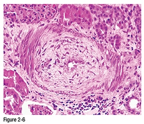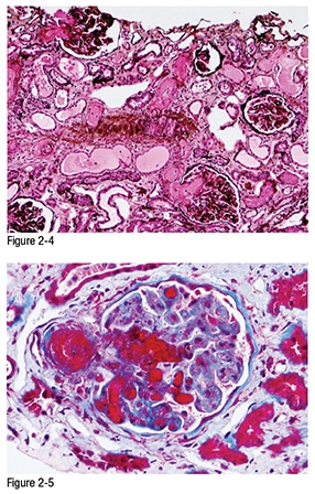 Light microscopy: On low power, there is fibrinoid necrosis of the interlobular arteries and arterioles with fibrin thrombi occluding the lumina and extending to the vascular poles in two glomeruli (top and bottom, Jones silver Figure 2-4). Medium power shows a glomerulus with thickening of the capillary walls caused by endothelial cell swelling and accumulation of material between the endothelial cells and the GBM; this has caused complete obliteration of several lumina, some containing fragmented red blood cells. The remaining lumina are obliterated by fuchsia-colored fibrin thrombi. The associated arteriole is also affected with fibrinoid necrosis and fibrin thrombus (trichrome Figure 2-5). The interlobular artery shows markedly expanded intima with mucoid change and myofibroblastic proliferation (mucoid intimal hyperplasia), leading to occlusion of the lumen (hematoxylin-eosin [H&E] Figure 2-6).