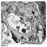 Electron microscopy: There is marked expansion of the lamina rara interna related to chronic endothelial cell injury with interposed degenerate cellular elements and entrapped fragmented red blood cells. The lumen is partially obliterated and contains fragments of a red blood cell and platelets, and is lined by an endothelial cell that has lost fenestration (Figure 2-7).