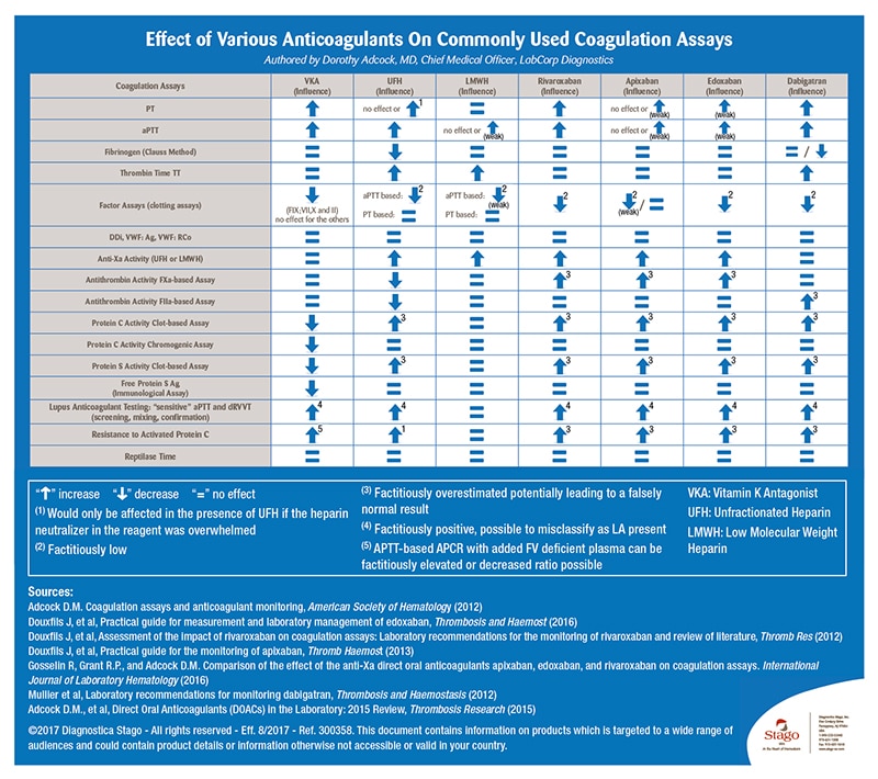 DOACs function as anticoagulants by inhibiting serine proteases, specifically thrombin and FXa, both of which are vital components of the coagulation cascade. These drugs therefore may affect commonly used global coagulation assays. DOACs can also interfere in a number of coagulation assay methodologies, causing assays to be spuriously elevated, spuriously decreased, as well as falsely positive (Gosselin RC, Adcock DM. J Thromb Haemost. 2016;14[5]:886–893). It is important to understand when the DOAC effect is causing a result to be truly abnormal or the DOAC impact causes a factitious laboratory result.