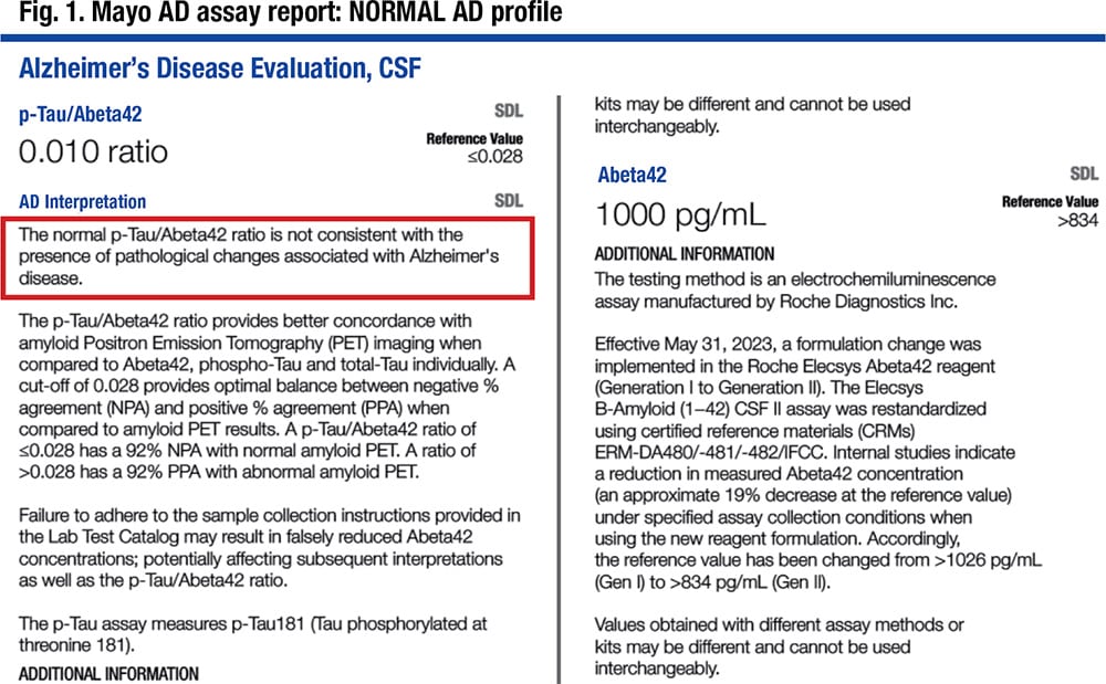 In Fig. 1 is a laboratory report. “The important value is the p-tau/Aβ42 value,” Dr. Bornhorst said, noting it is 0.010 and reported as a normal profile, not consistent with the presence of pathological changes associated with Alzheimer’s disease. The components are reported quantitatively but without interpretation. An elevated t-tau level may point to other neurological diagnoses.