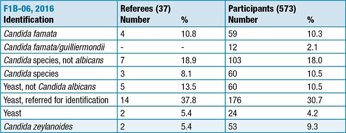 Few participants chose a combined category of Candida famata/C guilliermondii in the 2016 CAP Master List of Fungi. The suggestion that C guilliermondii is a likely misdiagnosis of C famata appears to be false.